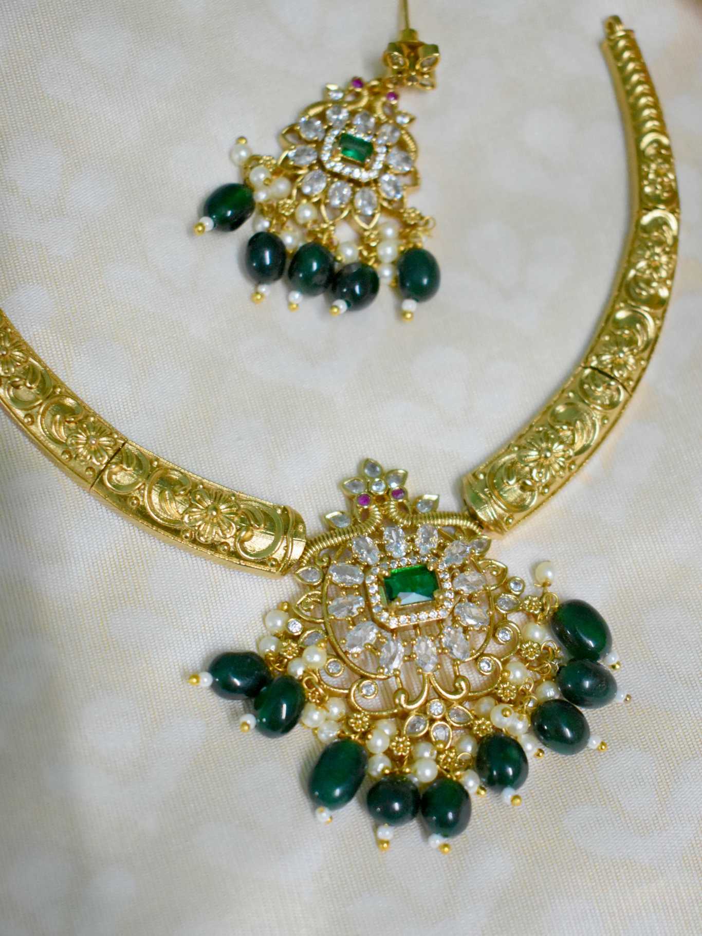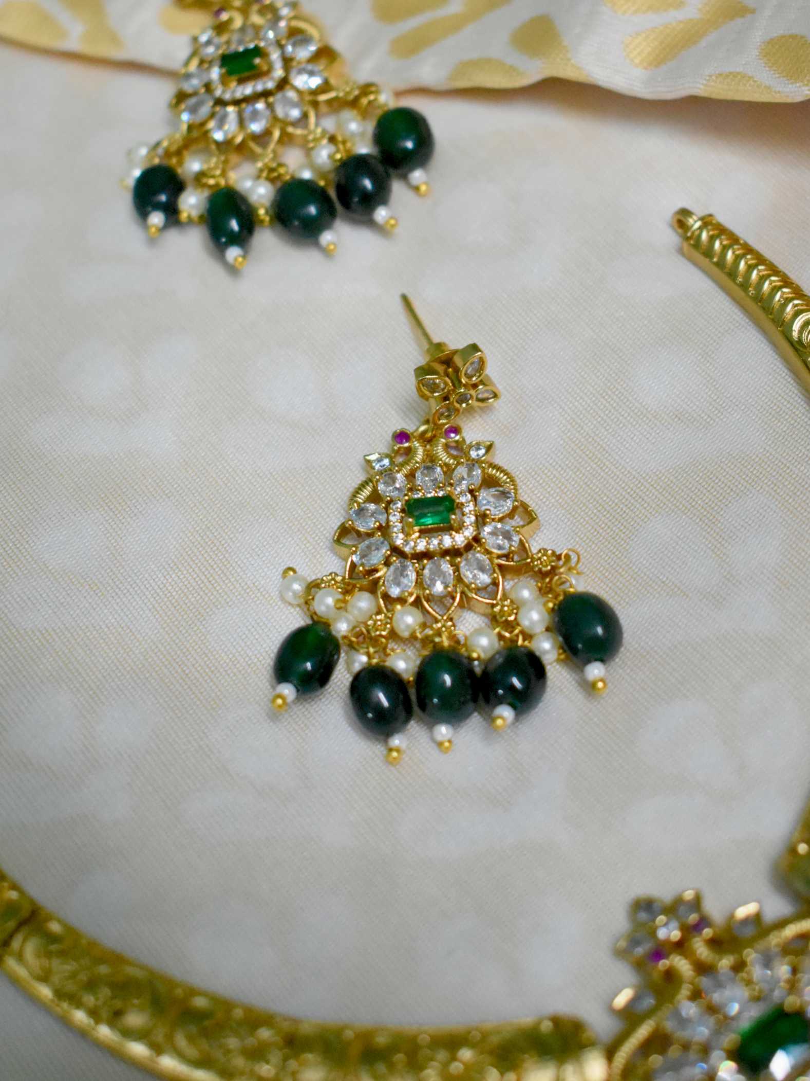 Add a pop of color and sparkle with this stunning Green Beads AD Gold Set! ✨